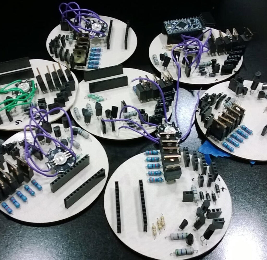 Manejamos creación artesanal en placa de cobre de una cara con la técnica Transfer y CNC. Para proyectos donde los circuitos son parte de la estética de la obra o donde se requiere robustez.