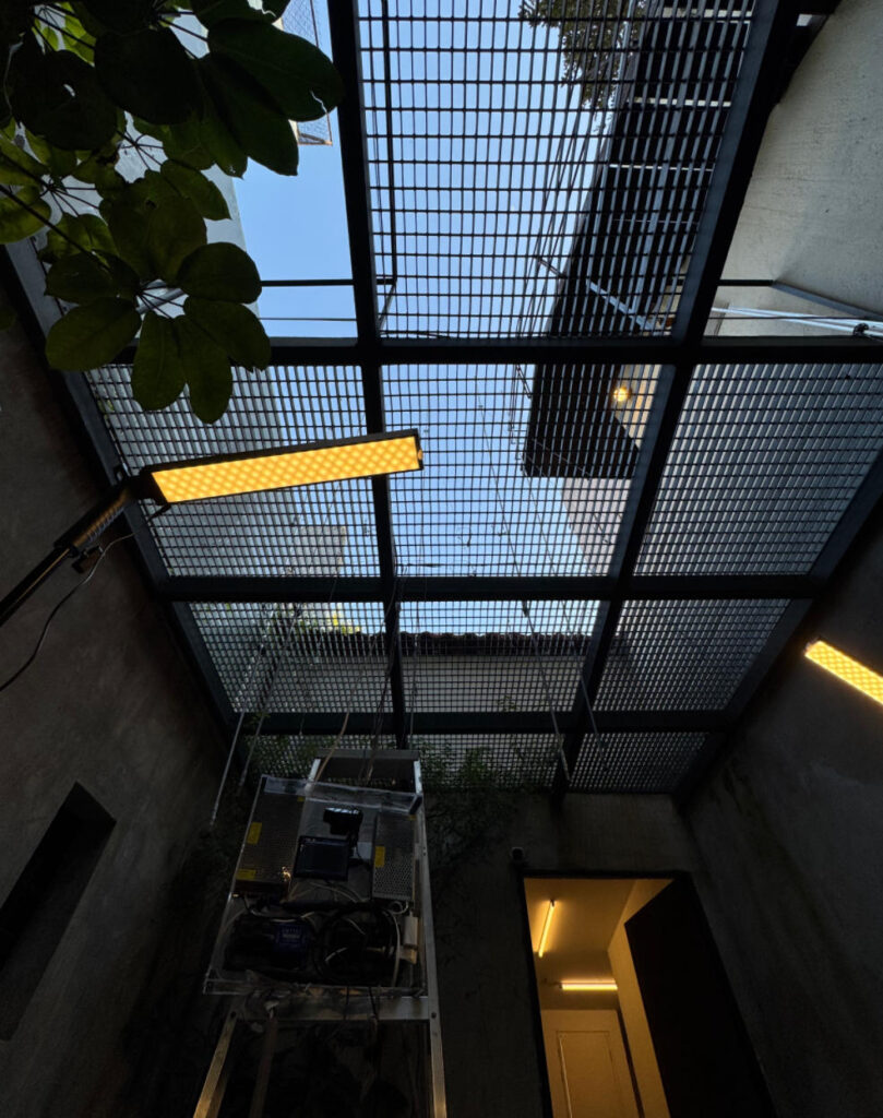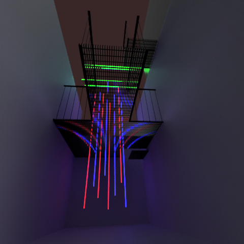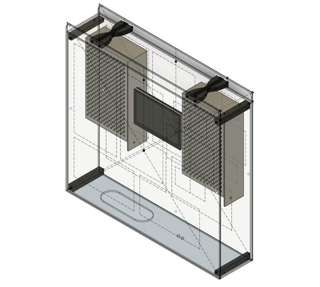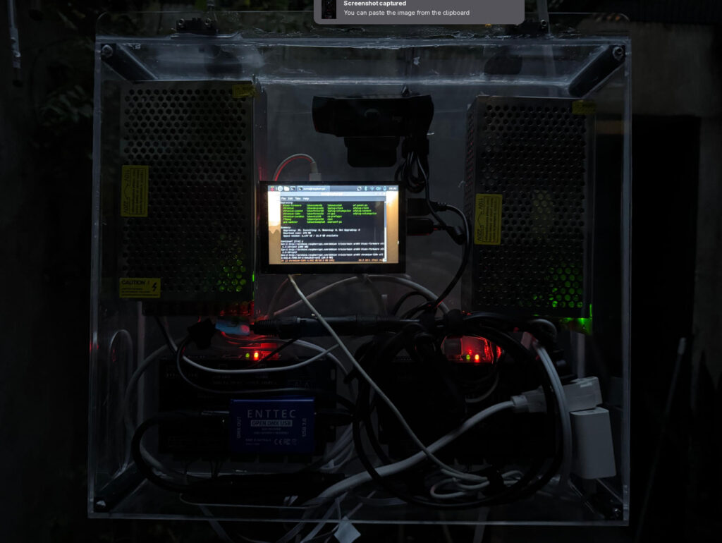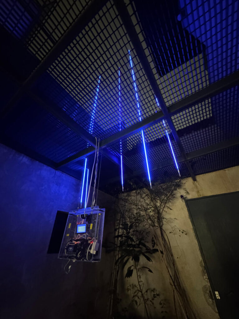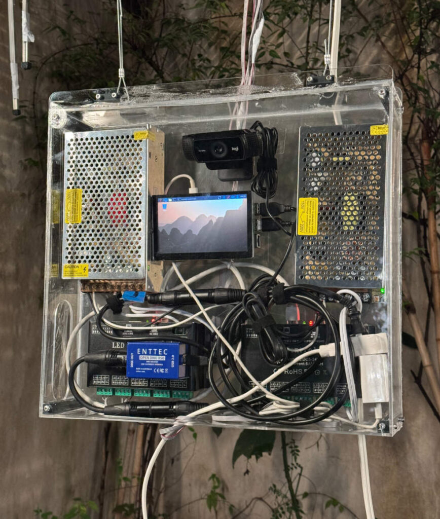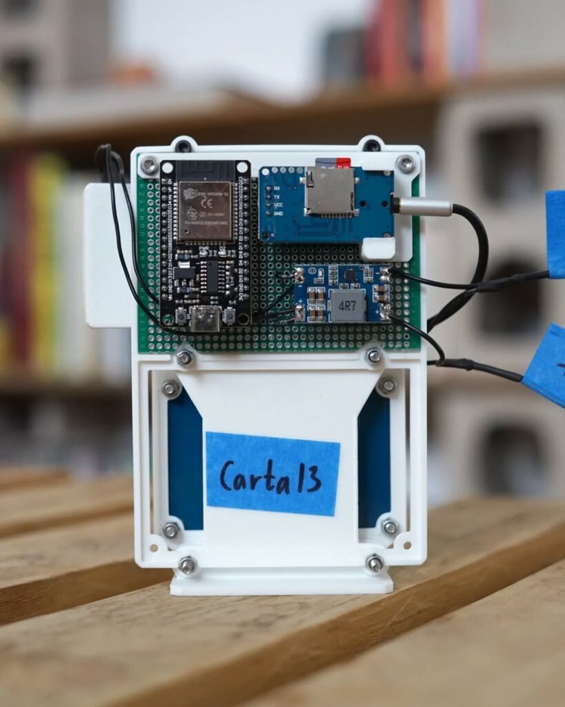 Para esta obra se realizó un circuito electrónico tipo flotante, el cual interconecta una serie de dispositivos comerciales. Dichos componentes consisten en una fuente de poder, dos drivers para motores a pasos y un micro controlador. Todo se interconecta con cables. Un elemento importante a destacar de este circuito, es que para manejar los drivers los cuales requieren señales de 5V, se utiliza un micro controlador ESP32 DevKit V1, el cual maneja señales de 3.3V; todo sin la necesidad de componentes electrónicos extra. Esto se logra con una conexión en modo Sink.
