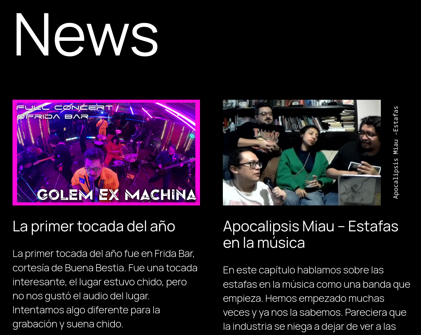Golem Ex Machina es un proyecto músical que consiste en hablar sobre los problemas modernos de la vida adulta, su postura cuestiona las prácticas comunes, como el capitalismo, el fascismo y los algoritmos. Una forma de resistir es teniendo presencia en medios clásicos, fuera de las limitaciones y abusos de las redes sociales. En un sitio web, no necesitas hacer una cuenta para registrarte o consultar el contenido, es indexable y es una forma robusta de mantener un archivo.