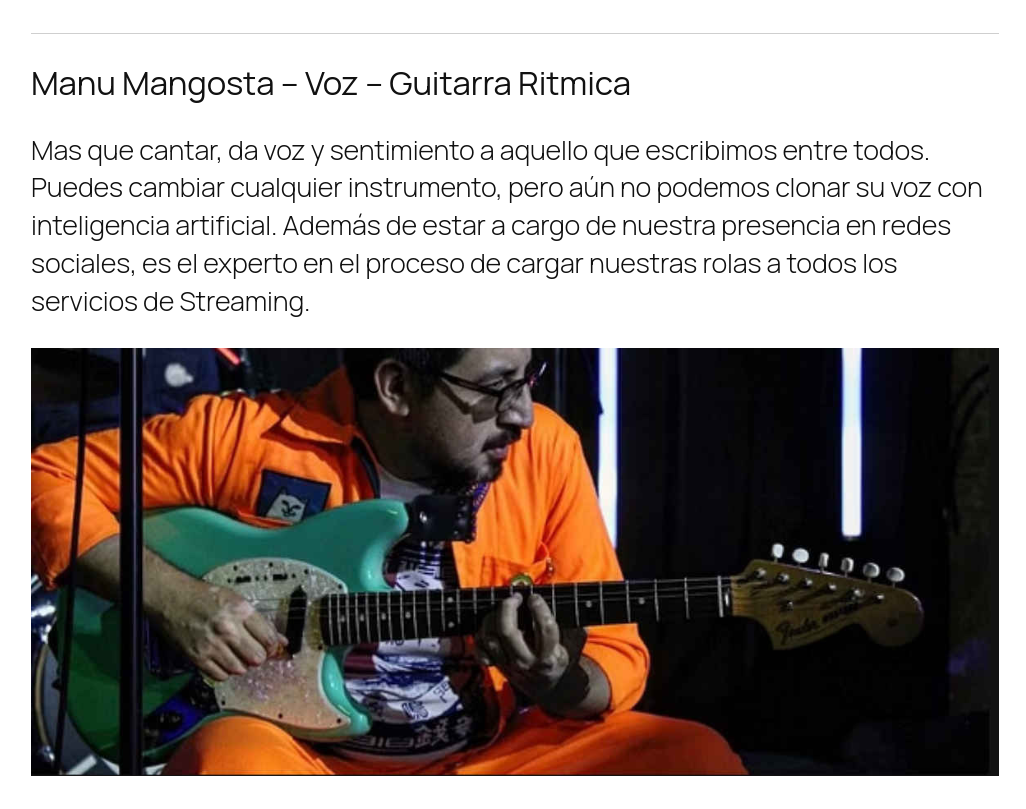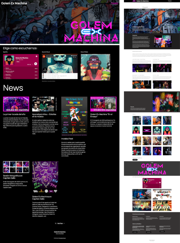 Para este proyecto se propone una versión simplificada, con una Landing Page con portada, logo, musica de la banda y noticias de eventos. El único enlace en la barra de navegación manda al Presskit, el cual contiene todos los elementos gráficos y de información para conocer a la banda, como son descripción, presentación de los integrantes, statement, galería, logo, música y eventos destacados, notas de prensa y contacto.
